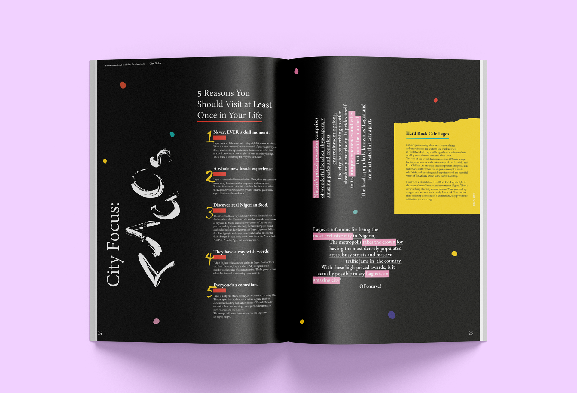 Create a nonconformist cover for Timeout Magazine including three double page spreads.